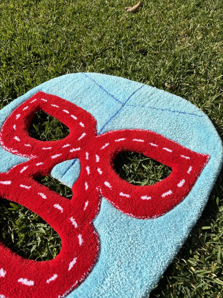 • Details: Nacho Mask is a wrestling-mask-inspired rug created with a nod to the Jack Black film Nacho Libre. Its hollow eye and mouth openings make it unique, letting the surface beneath show through for a playful, standout effect.